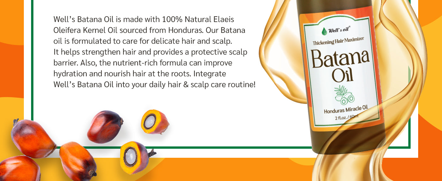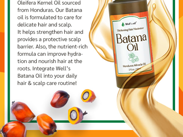 Well’s Batana Oil is made with 100% Natural Elaeis Oleifera Kernel Oil sourced from Honduras. Our Batana oil is formulated to care for delicate hair and scalp. It helps strengthen hair and provides a protective scalp barrier. Also, the nutrient-rich formula can improve hydration and nourish hair at the roots. Integrate Well’s Batana Oil into your daily hair & scalp care routine!