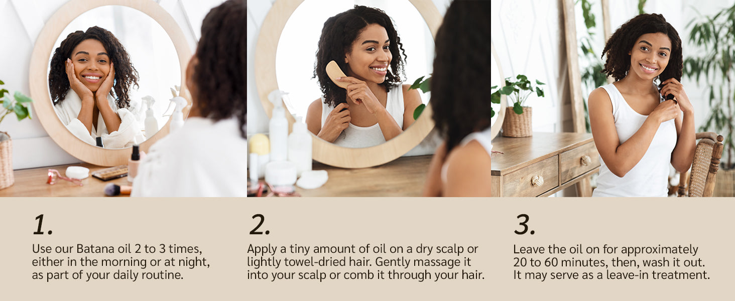 - Use our Batana oil 2 to 3 times, either in the morning or at night, as part of your daily routine.