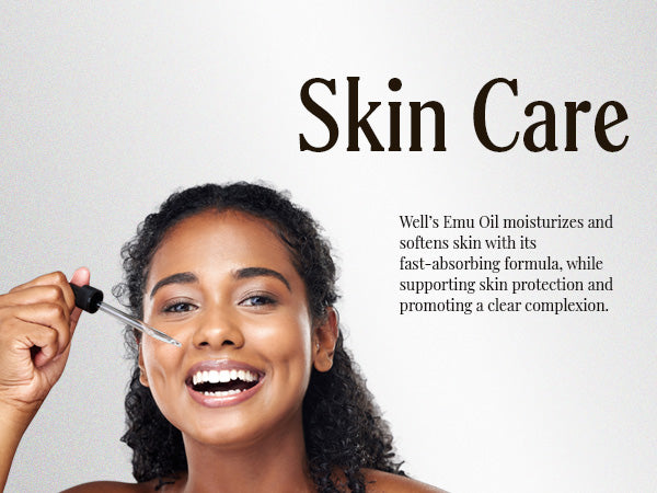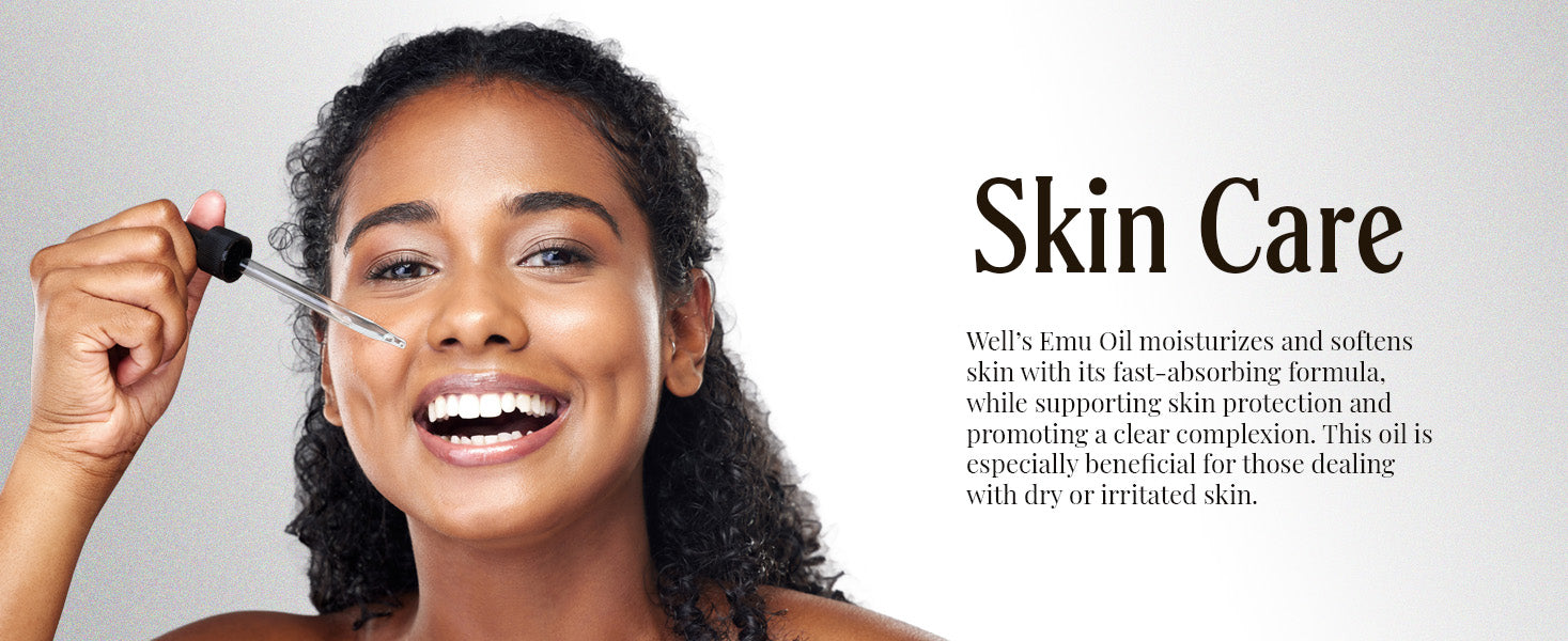 - For your skin: Well’s Emu Oil moisturizes and softens skin with its fast-absorbing formula, while supporting skin protection and promoting a clear complexion. This oil is especially beneficial for those dealing with dry or irritated skin.