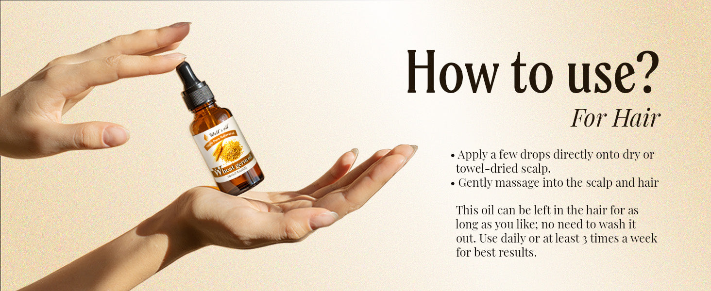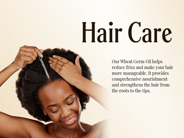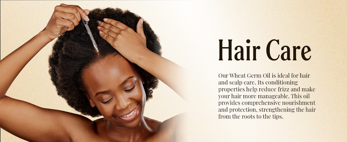 - For your hair: Our Wheat Germ Oil is ideal for hair and scalp care. Its conditioning properties help reduce frizz and make your hair more manageable. This oil provides comprehensive nourishment and protection, strengthening the hair from the roots to the tips.