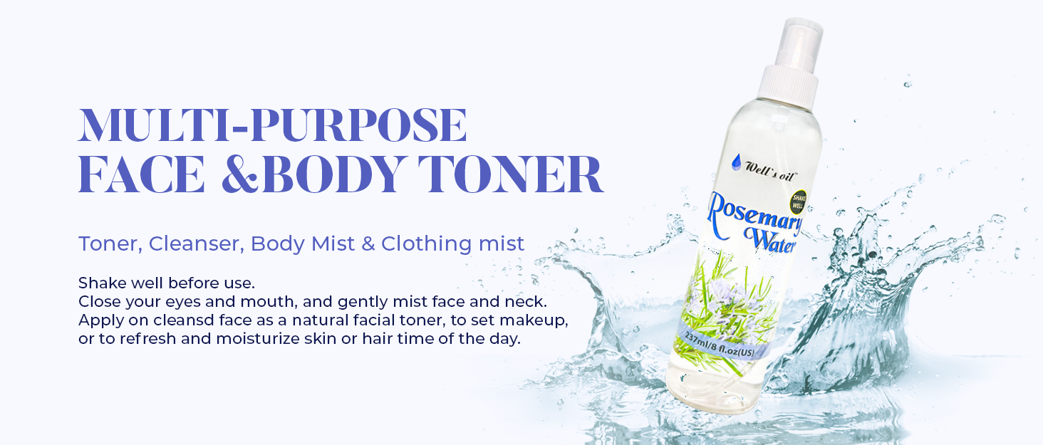 - Skin Care: Well's Rosemary Water effectively cleanses the skin by removing impurities and excess sebum, maintaining clarity. Enriched with natural nutrients, it moisturizes, nourishes, and soothes tired skin, keeping it fresh, soft, and restoring its natural balance.